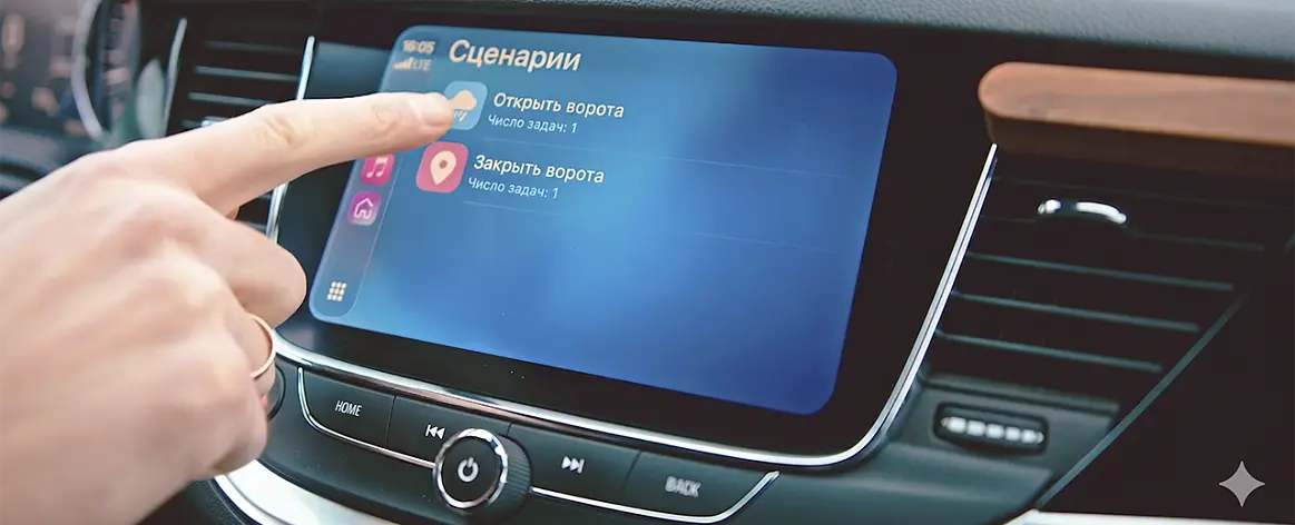 Подключите смартфон с приложением ALUTECH Smart к мультимедийной системе CarPlay или AndroidAuto. Это позволит управлять воротами с бортового компьютера вашего авто.